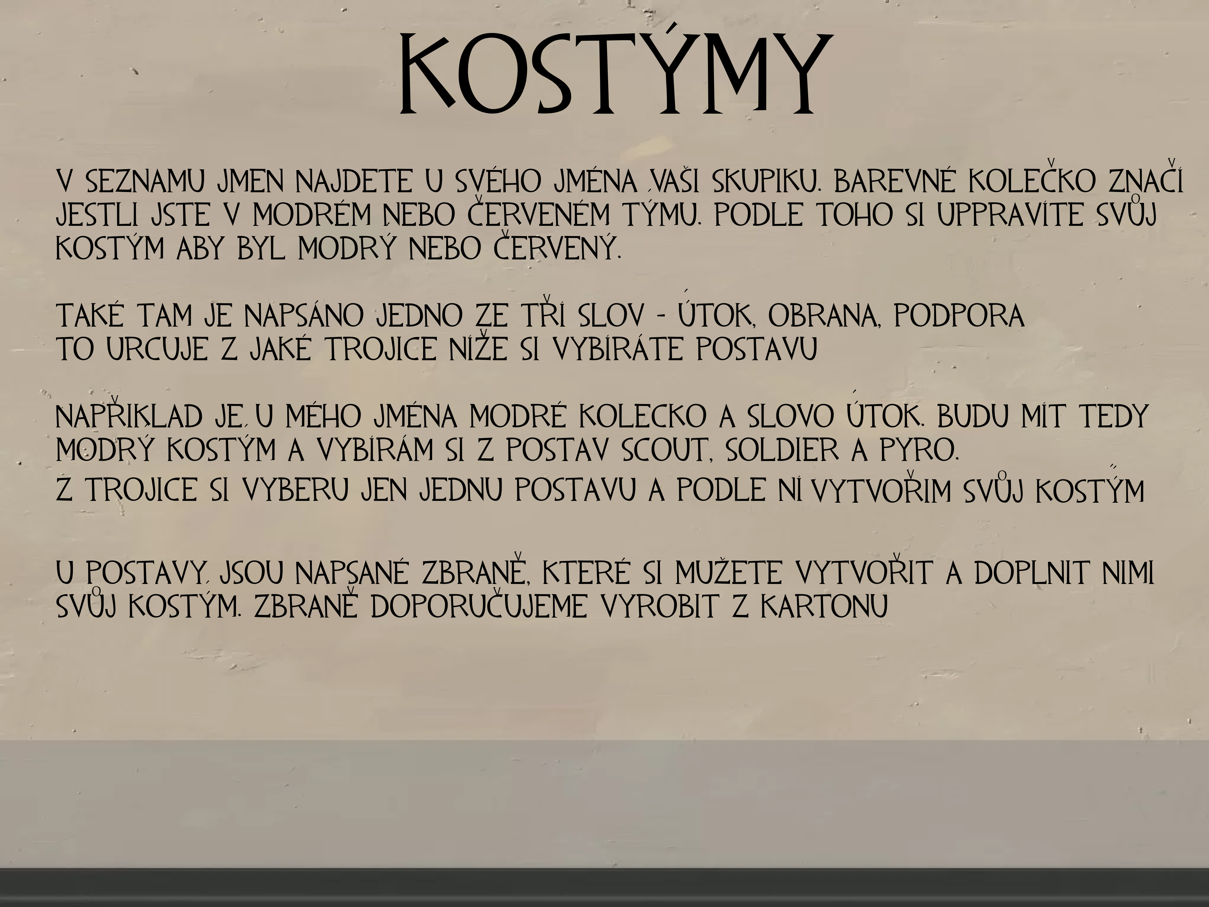 Letos vám byly přiřazeny skupinky a s nimi i postavy ze kterých si vybíráte. Zdali budete na straně Červených či Modrých, to se dozvíte na táborových stránkách v sekci účastníci.